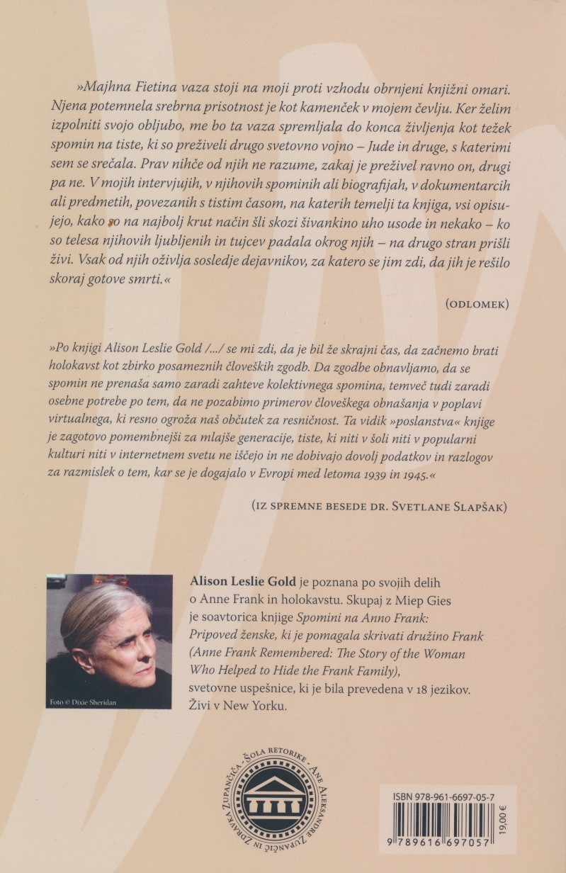 »Majhna Fietina vaza stoji na moji proti vzhodu obrnjeni knjižni omari. Njena potemnela srebrna prisotnost je kot kamenček v mojem čevlju. Ker želim izpolniti svojo obljubo, me bo ta vaza spremljala do konca življenja kot težek spomin na tiste, ki so preživeli drugo svetovno vojno – Jude in druge, s katerimi sem se srečala. Prav nihče od njih ne razume, zakaj je preživel ravno on, drugi pa ne. V mojih intervjujih, v njihovih spominih ali biografijah, v dokumentarcih ali predmetih, povezanih s tistim časom, na katerih temelji ta knjiga, vsi opisujejo, kako so na najbolj krut način šli skozi šivankino uho usode in nekako – ko so telesa njihovih ljubljenih in tujcev padala okrog njih – na drugo stran prišli živi. Vsak od njih oživlja sosledje dejavnikov, za katero se jim zdi, da jih je rešilo skoraj gotove smrti.«