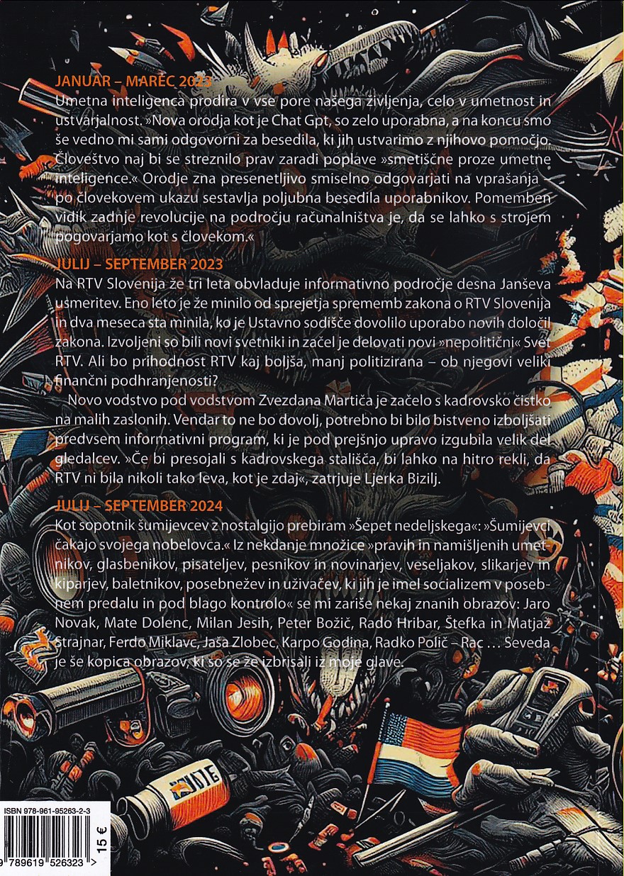 Dvanajsta kronika je vendarle tudi posebna, saj je obeležena z nadaljevanjem ‘norega svetovnega reda’, ki ga je vzpostavil koronavirus v letu 2020 in še kar traja. Človeštvo nanj še ni našlo dokončnega odgovora. Še manj pa je našlo odgovor na velike podnebne spremembe na planetu, ki grozijo z uničenjem naše civilizacije. K vsemu temu pa je prišla še Putinova imperialna vojna v Ukrajini in vojna med Izraelom in Palestino – z uničevanjem Gaze. Nori svetovni red se samo zlovešče nadaljuje.
