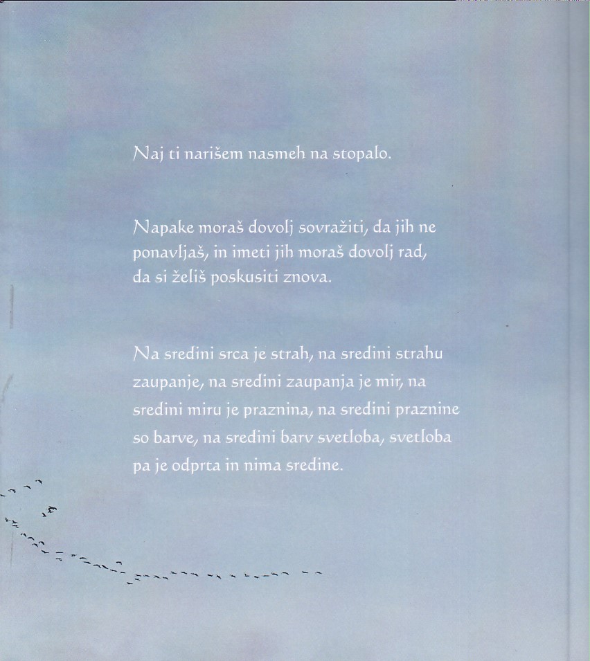 - Na sredini srca je strah, na sredini strahu zaupanje, na sredini zaupanja je mir, na sredini miru je praznina, na sredini praznine so barve, na sredini barv svetloba, svetloba pa je odprta in nima sredine.