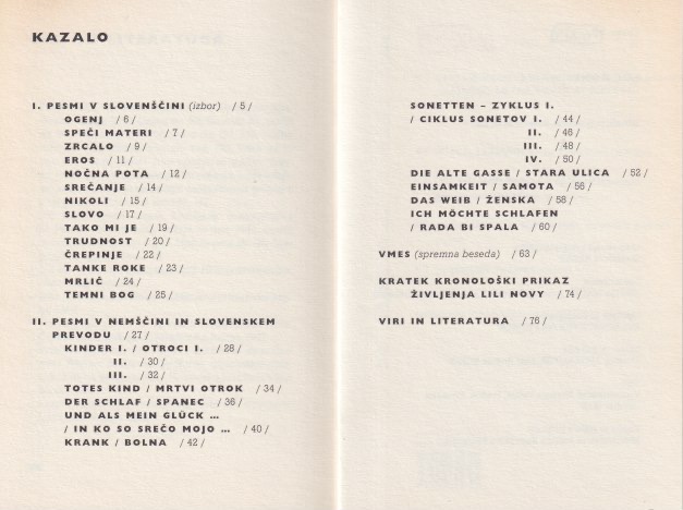 Zbirka Črepinje in druge pesmi prinaša izbor poezije Lili Novy, ene pomembnejših pesniških glasov slovenskega prostora, ki je ustvarjala tako v nemščini kot v slovenščini. Knjiga omogoča vpogled v oba vidika njenega pesniškega izraza ter odpira prostor za neposredno primerjavo med izvirnim in prevedenim besedilom.
