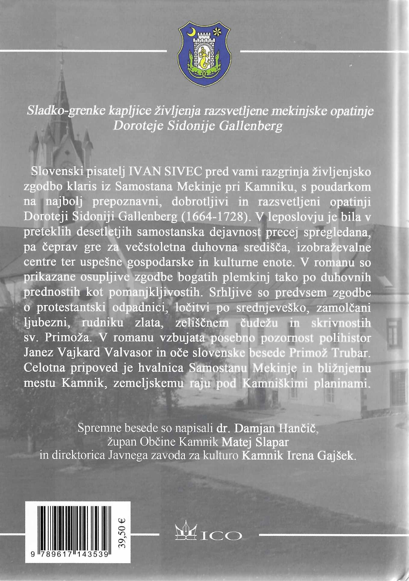 Roman je hkrati poklon samostanu Mekinje in mestu Kamnik, ki ga avtor opisuje kot slikovit prostor pod Kamniškimi planinami. Pripoved združuje zgodovinska dejstva, legende in literarno domišljijo ter odpira manj znano poglavje slovenske zgodovine.