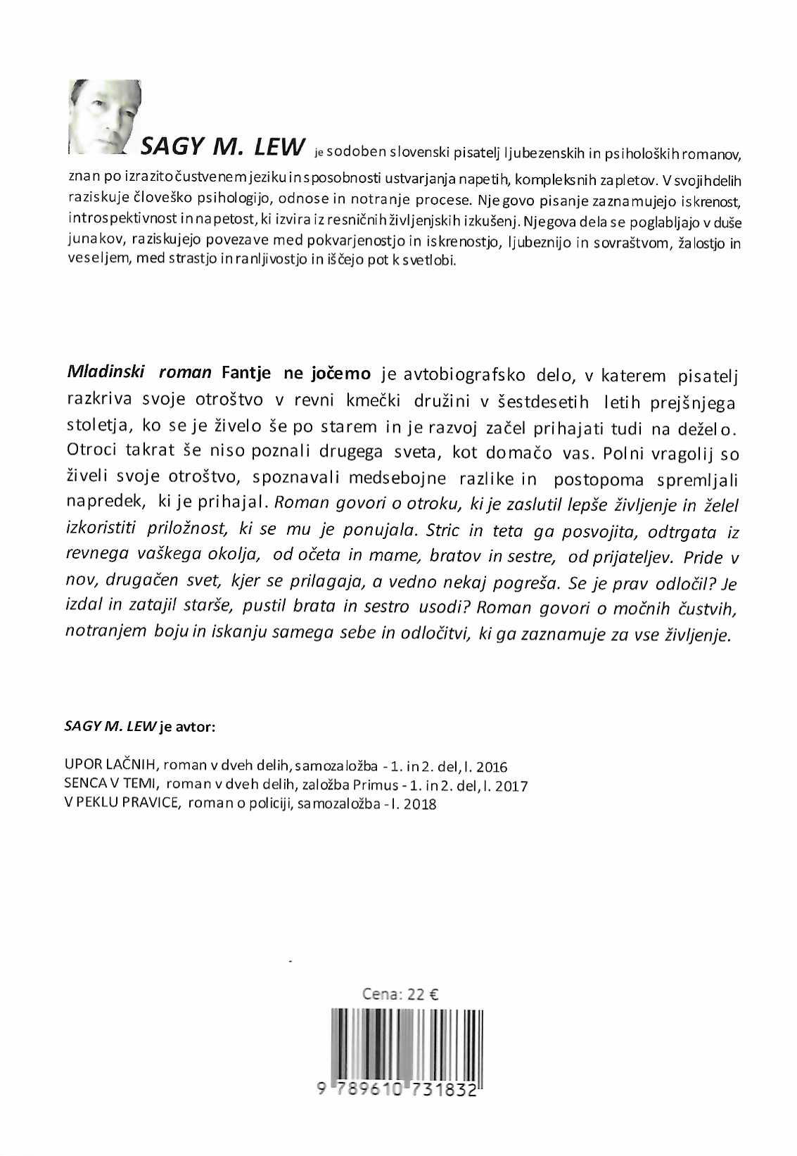 SAGY M. LEW je sodoben slovenski pisatelj ljubezenskih in psiholoških romanov, znan po izrazito čustvenem jeziku in sposobnosti ustvarjanja napetih, kompleksnih zapletov. V svojih delih raziskuje človeško psihologijo, odnose in notranje procese. Njegovo pisanje zaznamujejo iskrenost, introspektivnost in napetost, ki izvira iz resničnih življenjskih izkušenj. Njegova dela se poglabljajo v duše junakov, raziskujejo povezave med pokvarjenostjo in iskrenostjo, ljubeznijo in sovraštvom, žalostjo in veseljem, med strastjo in ranljivostjo in iščejo pot k svetlobi.