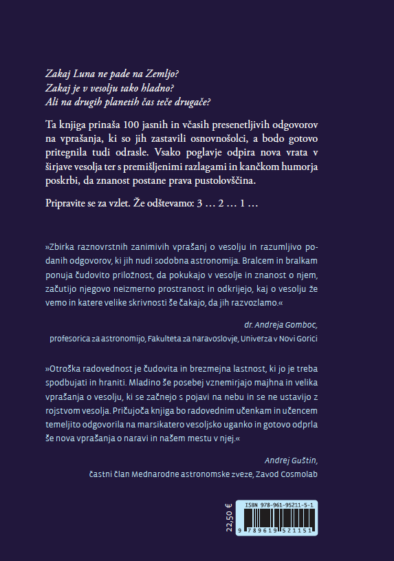 »Zbirka raznovrstnih zanimivih vprašanj o vesolju in razumljivo podani odgovori, ki jih nudi sodobna astronomija. Bralcem in bralkam ponuja čudovito priložnost, da pokukajo v vesolje in znanost o njem, začutijo njegovo neizmerno prostranost in odkrijejo, kaj o vesolju že vemo in katere velike skrivnosti še čakajo, da jih razvozlamo.« – dr. Andreja Gomboc, profesorica za astronomijo, Fakulteta za naravoslovje, Univerza v Novi Gorici