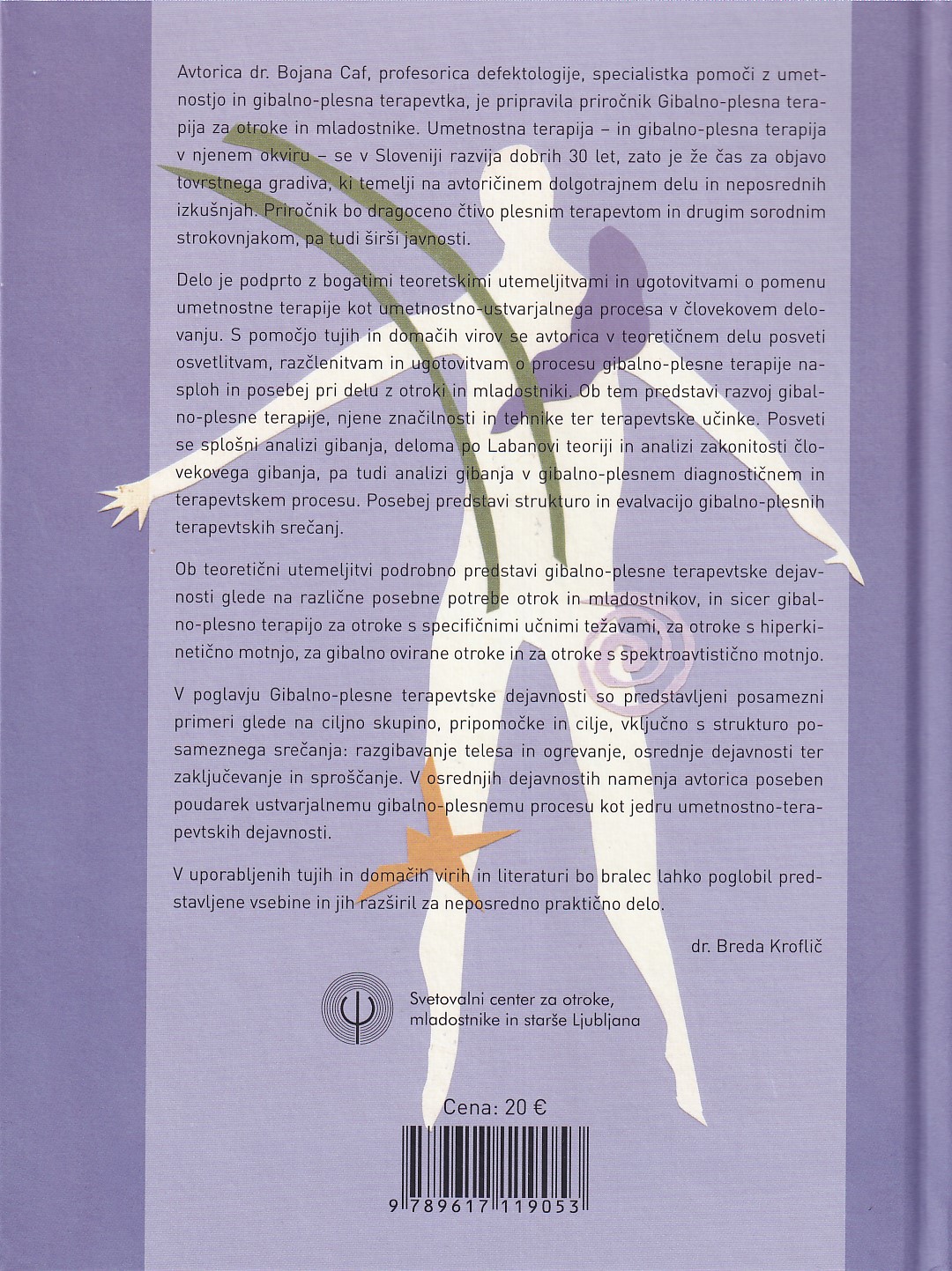 Delo je podprto z bogatimi teoretskimi utemeljitvami in ugotovitvami o pomeni umetnostne terapije kot umetnostno-ustvarjalnega procesa v človekovem delovanju. S pomočjo tujih in domačih virov se avtorica v teoretičnem delu posveti osvetlitvam, razčlenitvam in ugotovitvam o procesu gibalno-plesne terapije nasploh in posebej pri delu z otroki in mladostniki. Ob tem predstavi razvoj gibalno-plesne terapije, njene značilnosti in tehnike ter terapevtske učinke. Posveti se splošno analizi gibanja, deloma po Labanovi teoriji in analizi zakonitosti človekovega gibanja, pa tudi analizi gibanja v gibalno-plesnem diagnostičnem in terapevtskem procesu. Posebej predstavi strukturo in evalvacijo gibalno-plesnih terapevtskih srečanj.