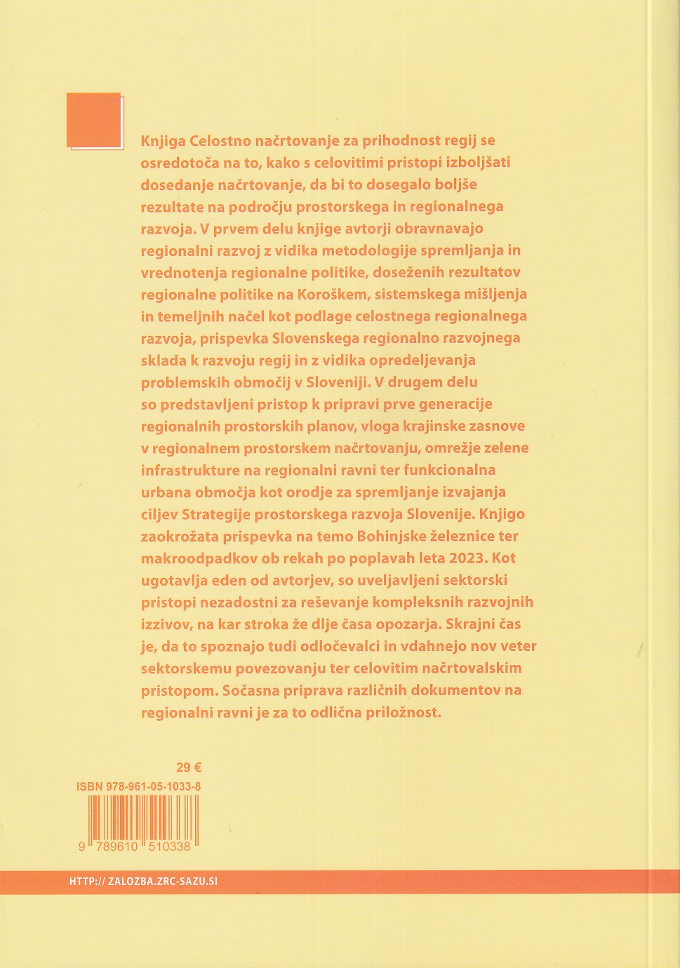 Knjigo zaokrožata prispevka o Bohinjski železnici in makroodpadkih po poplavah leta 2023. Avtorji opozarjajo, da sektorski pristopi ne zadoščajo za soočanje s kompleksnimi izzivi sodobnega razvoja. Zato je nujno, da odločevalci okrepijo sektorsko povezovanje in spodbujajo celostne načrtovalske pristope. Sočasna priprava različnih dokumentov na regionalni ravni je za to izjemna priložnost.