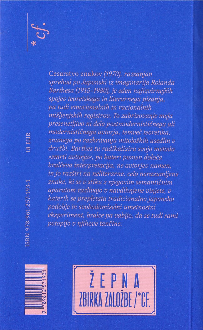 Barthes tu radikalizira svojo metodo »smrti avtorja«, po kateri pomen določa bralčeva interpretacija, ne avtorjev namen, in jo razširi na neliterarne, celo nerazumljene znake, ki se v stiku z njegovim semantičnim aparatom razlivajo v navdihnjene vinjete, v katerih se prepletata tradicionalno japonsko podobje in svobodomiselni umetnostni eksperiment, bralce pa vabijo, da se tudi sami potopijo v njihove tančine.