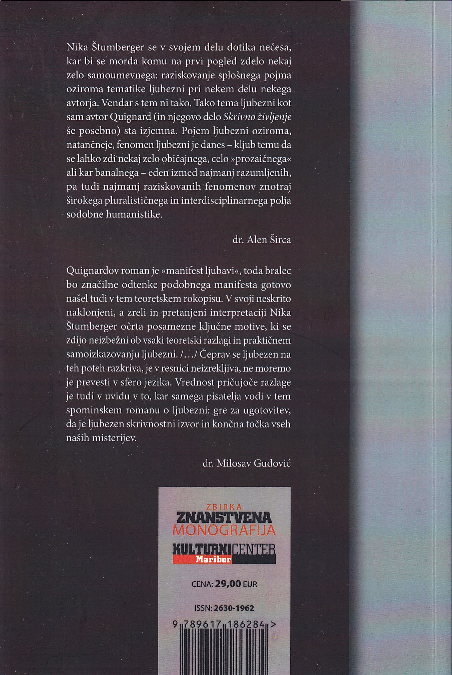 Quignardov roman je “manifest ljubavi”, toda bralec bo značilne odtenke podobnega manifesta gotovo našel tudi v tem teoretskem rokopisu. /…/ Vrednost pričujoče razlage je tudi v uvidu v to, kar samega pisatelja vodi v tem spominskem romanu o ljubezni: gre za ugotovitev, da je ljubezen skrivnostni izvor in končna točka vseh naših misterijev. (dr. Milosav Gudović)