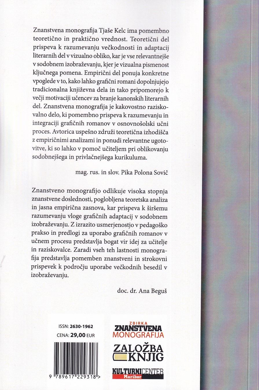 Znanstvena monografija Tjaše Kelc ima pomembno teoretično in praktično vrednost. Teoretični del prispeva k razumevanju večkodnosti in adaptacij literarnih del v vizualno obliko, kar je vse relevantnejše v sodobnem izo- braževanju, kjer je vizualna pismenost ključnega pomena. Empirični del ponuja konkretne vpoglede v to, kako lahko grafični romani dopolnjujejo tradicionalna književna dela in tako pripomorejo k večji motivaciji učencev za branje kanonskih literarnih del. Znanstvena monografija je kakovostno raziskovalno delo, ki pomembno prispeva k razumevanju in integraciji grafičnih romanov v osnovnošolski učni proces.