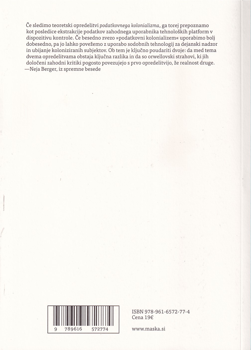 Podatkovne prakse v izvotljenem družbenem svetu podatkovnega kolonializma vsakdanjemu življenju nalagajo zahtevo po podreditvi sledenju in sklapljajo področje delovanja jaza z mrežo podatkovne ekstrakcije, mrežo, ki jo zakonodaja komajda regulira, ter na ta način vdirajo v minimalni prostor jaza. Ekstraktivna družbena razmerja, na katerih temelji podatkovni kolonializem, narekujejo temeljno obliko razlaščanja. Življenje, ki mu nekdo nenehno sledi, je razlaščeno življenje, v katerega prostor ves čas vdira in ga podreja ekstrakciji zunanja oblast.
