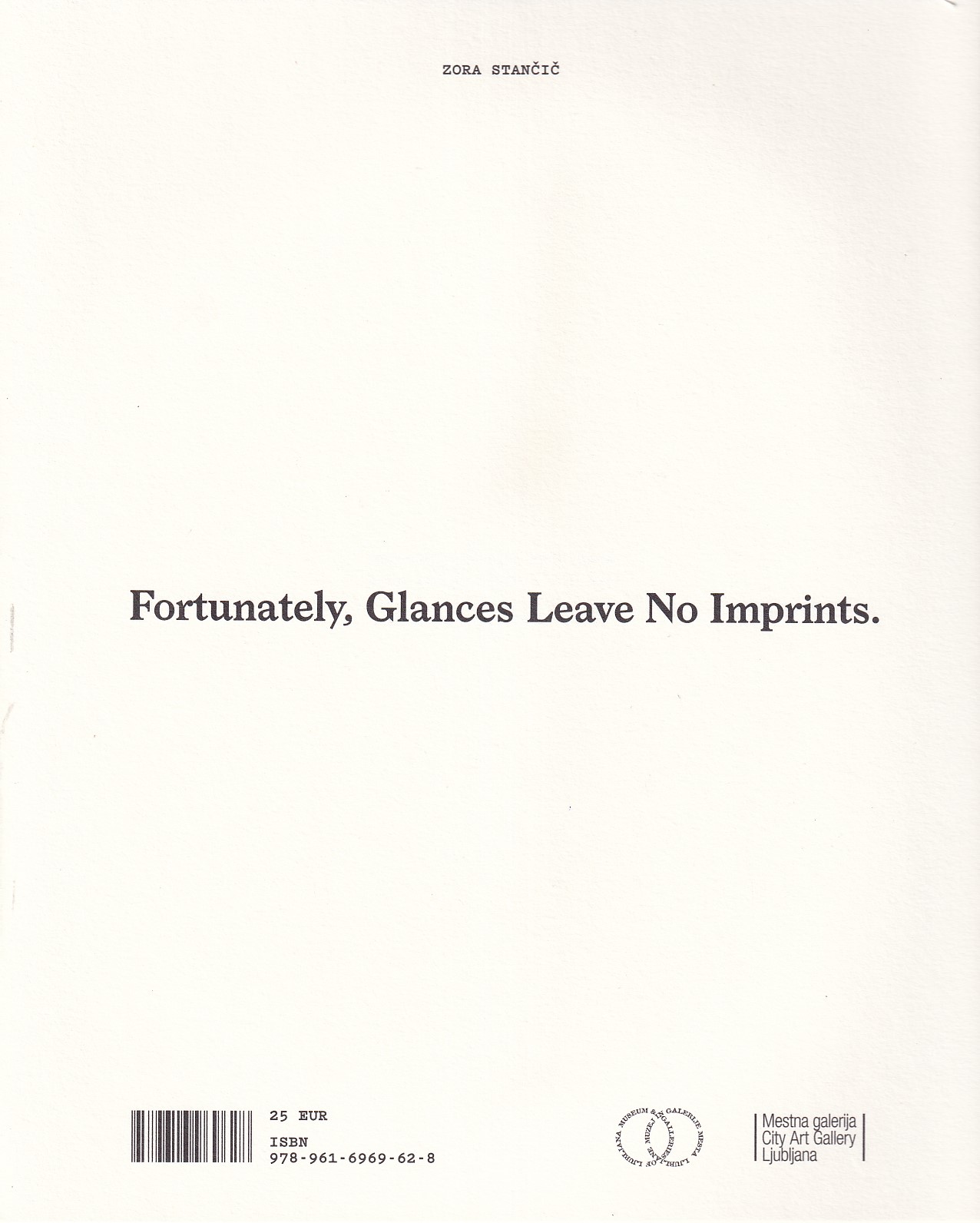 Obrazstavni katalog, ki spremlja pregledno razstavo Zora Stančič: Dobro, da pogledi ne puščajo odtisov v Mestni galeriji Ljubljana, je več kot zgolj dokument razstave – je samostojno umetniško delo in dragocen arhiv skoraj večdesetletnega ustvarjanja ene najpomembnejših slovenskih vizualnih umetnic.