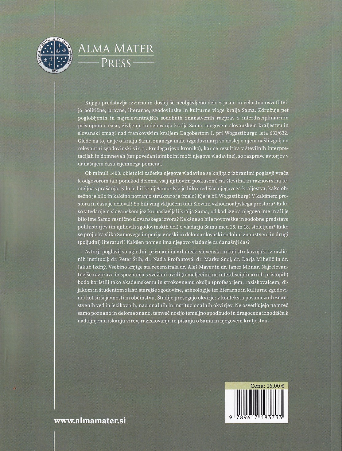Delo ponuja celovit pogled na kralja Sama, prvega znanega vladarja Slovanov, ki je v 7. stoletju vzpostavil slovansko kraljestvo. Delo se skozi politični, zgodovinski, literarni in kulturni pogled poglobi v njegovo življenje, vladavino in vpliv na slovansko ozemlje.